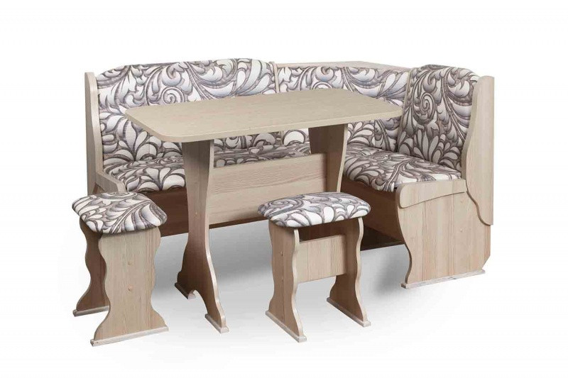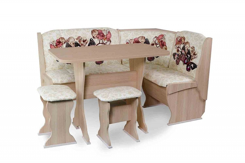 Особенности уголка: Замечательный вариант организации комфортной обеденной зоны на кухне без лишних затрат. Нежный или яркий цветочный принт на высококачественной экокоже. Большой выбор обивочных материалов позволит подобрать лучший дизайн данной меблировки, который подойдет к интерьеру и будет радовать каждый день. Кухонный угловой диван с 2 ящиками, каркас ЛДСП обработан кромкой ПВХ. Термостойкая пластиковая столешница. Угол собирается как в правом, так и в левом исполнении.