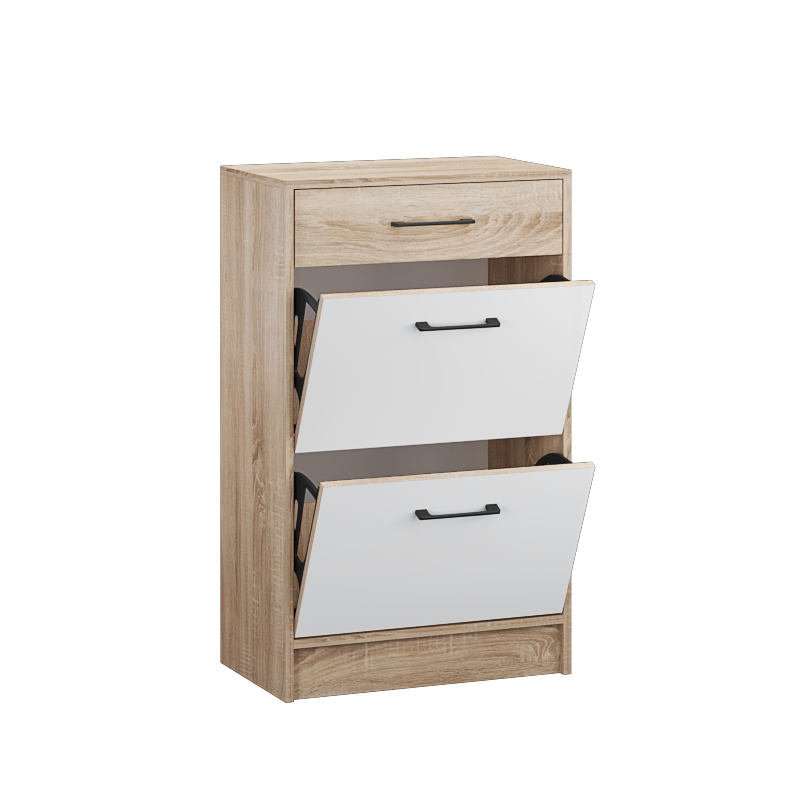 Обувница Денвер с 2-мя вместительными откидными полками и ящиком - оптимальное решение для хранения обуви в прихожей. Характеристики: Размер, мм: 600х990х360 Цвет: Дуб сонома/Белый с тиснением древесные опоры Материал: ЛДСП Особенности: современный стиль хорошая вместимость черные металлические ручки