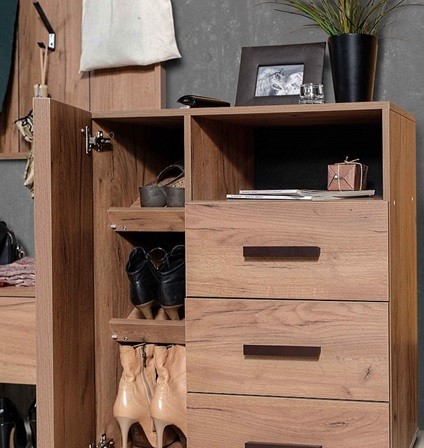 Комбинированная тумба для обуви Nature 89 - удобная и продуманная система хранения обуви для всей семьи. Тумба состоит из трех выдвижных ящиков и отделением за распашной дверцей. За распашным фасадом Контур находятся две полки для хранения обуви, которые находятся наискосок. Полки регулируются по высоте, для этого полкодержатели необходимо установить в подготовленные отверстия. Модуль можно собирать как на левую, так и правую сторону. Особенности ручки из массива березы левосторонняя и правосторонняя сборка выдвижные ящики на шариковых направляющих регулируемые опоры